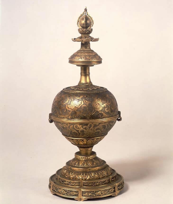 能作生塔は仏舎利を納める舎利塔の一種で、能作生とは万物生成をつかさどる根源の珠・如意宝珠を納める塔です。頂には三方火焔付き宝珠を蓮台にのせ、塔身部は魚々子(ななこ)地に蓮華唐草文様を線刻し鍍金・鍍銀を施こされています。