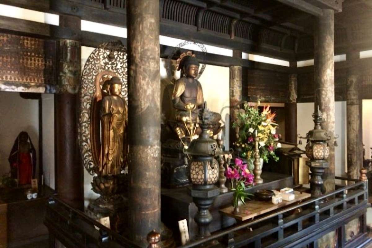 桁行5間・梁間3間入母屋造 ・本瓦葺の建物です。鎌倉時代に再興された時の建物で、本堂内部は正面1間を外陣とし内陣に広い須弥壇を設け、その上に来迎柱2本が立ちます。来迎柱や長押(なげし)上の欄間板に千体仏図や天女図、内陣四天柱に仏菩薩図や仏来迎図が極彩色で描かれています。