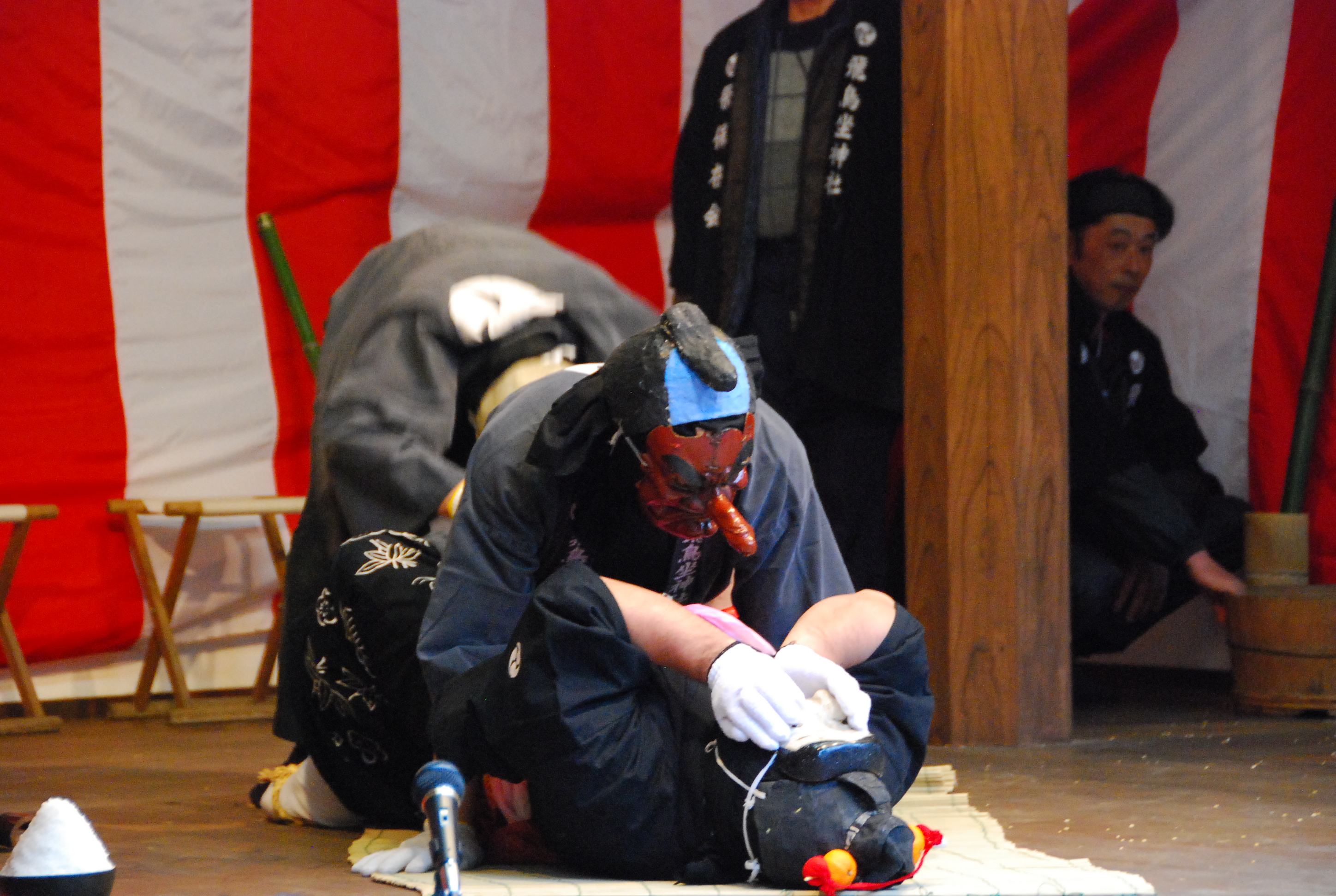 さてここから第二幕になりクライマックスとなる「種つけ」です。登場人物は、天狗・お多福・翁の三人です。三番太鼓を合図とともに登場し、夫婦愛和合の様を実演します。この式を「種つけ」と言います。