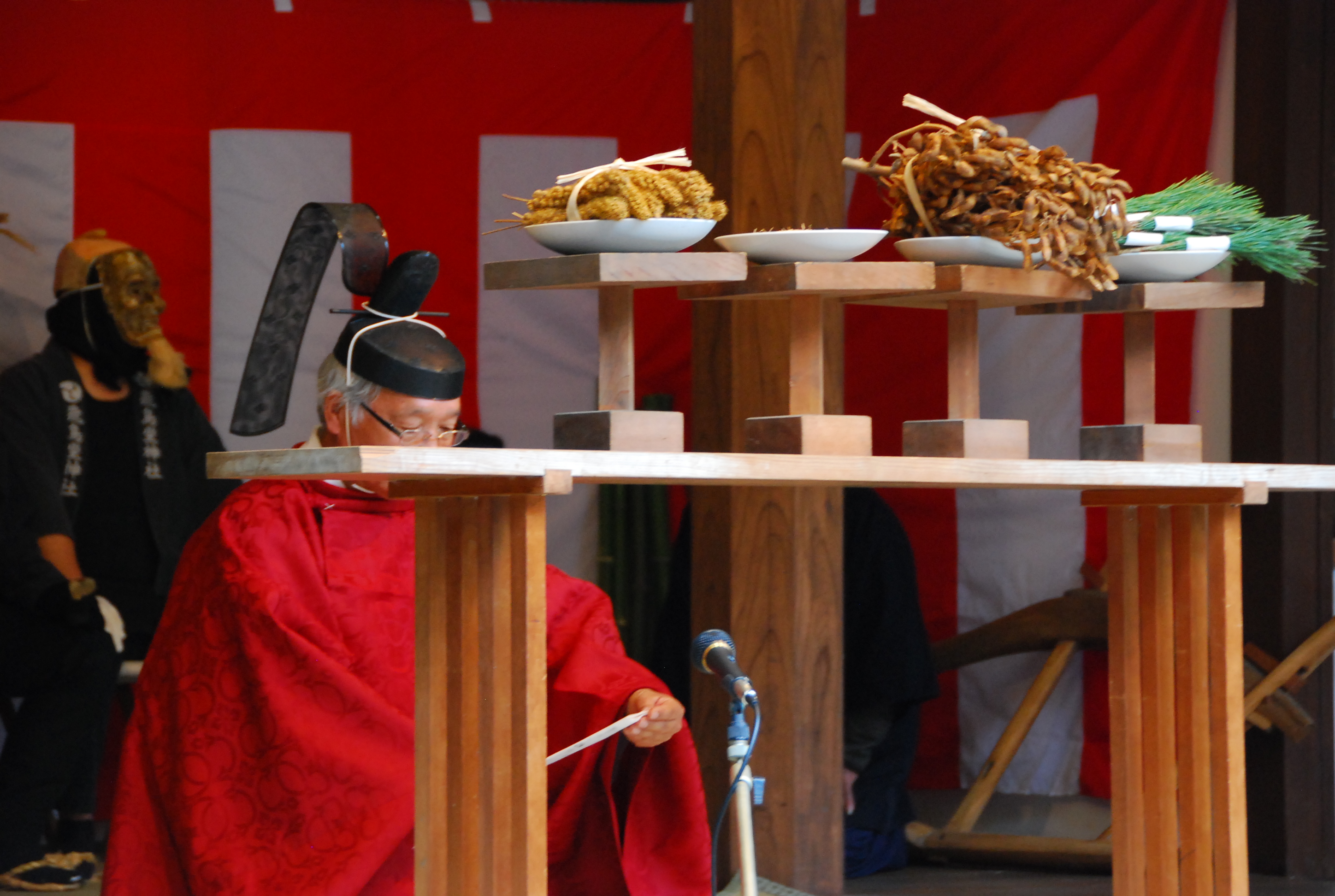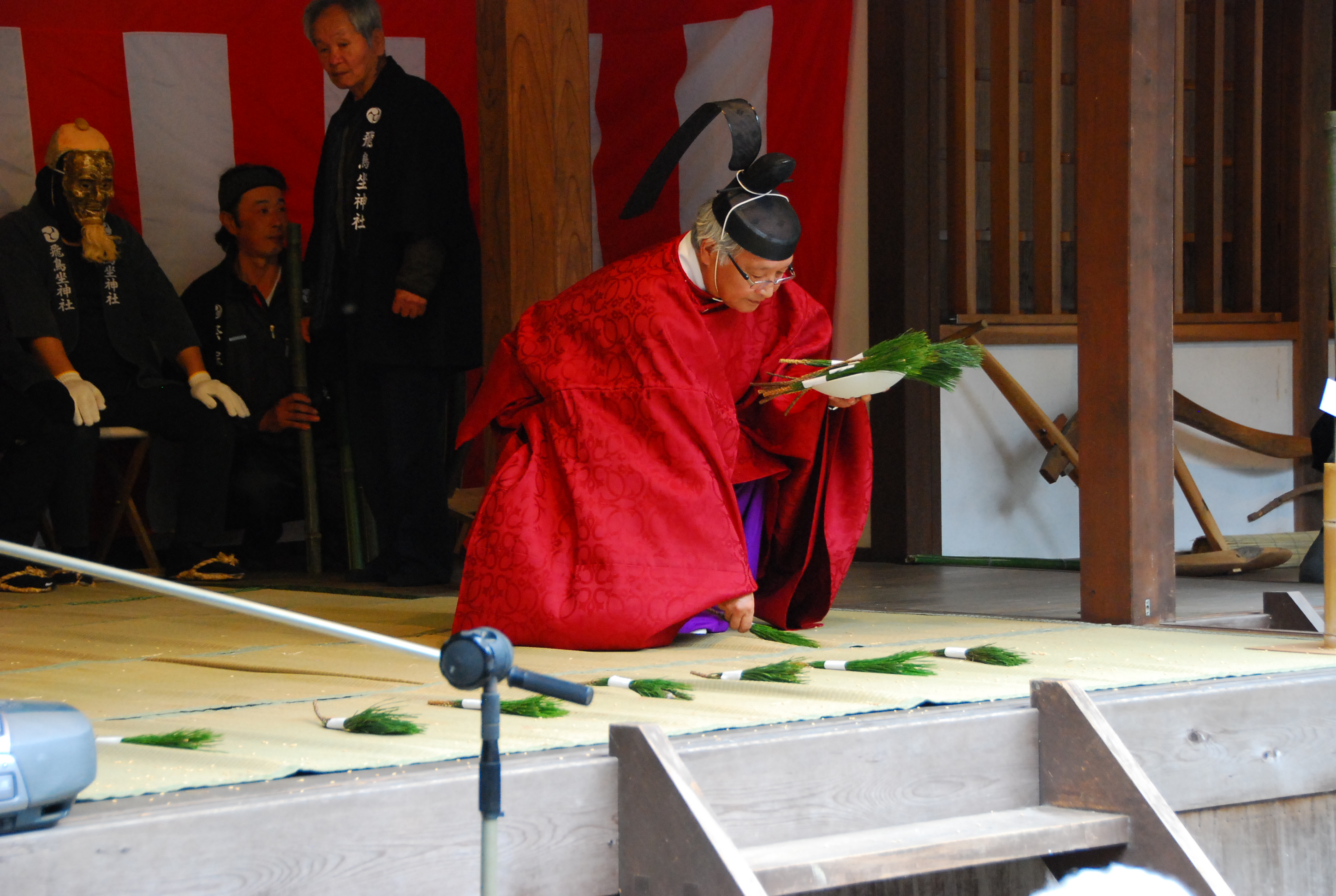 耕す工程が終われば、宮司による植付けが行われます。苗にみたてた松を植え(置く)、演目が終了すると松は観衆のほ方へ投げられます。