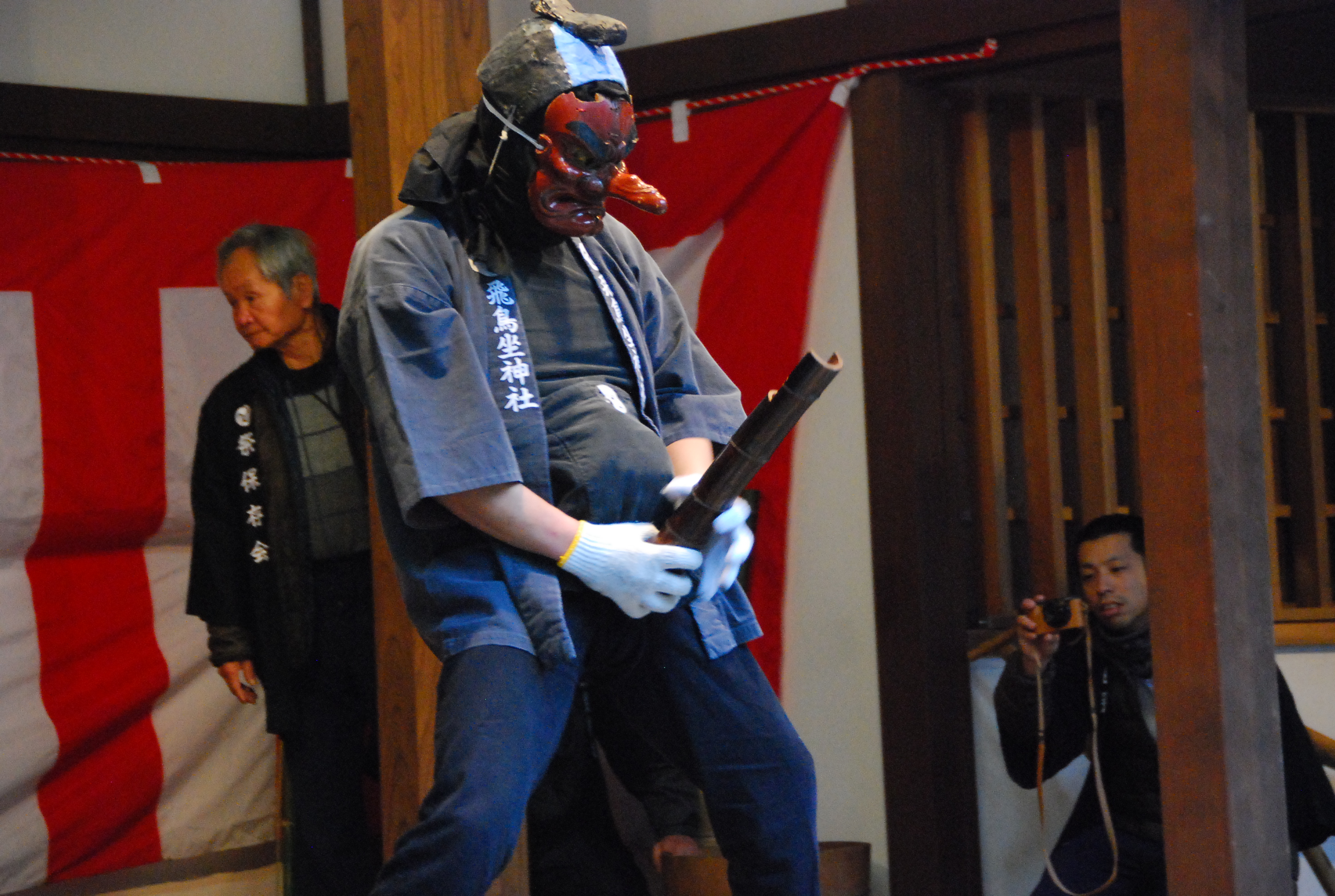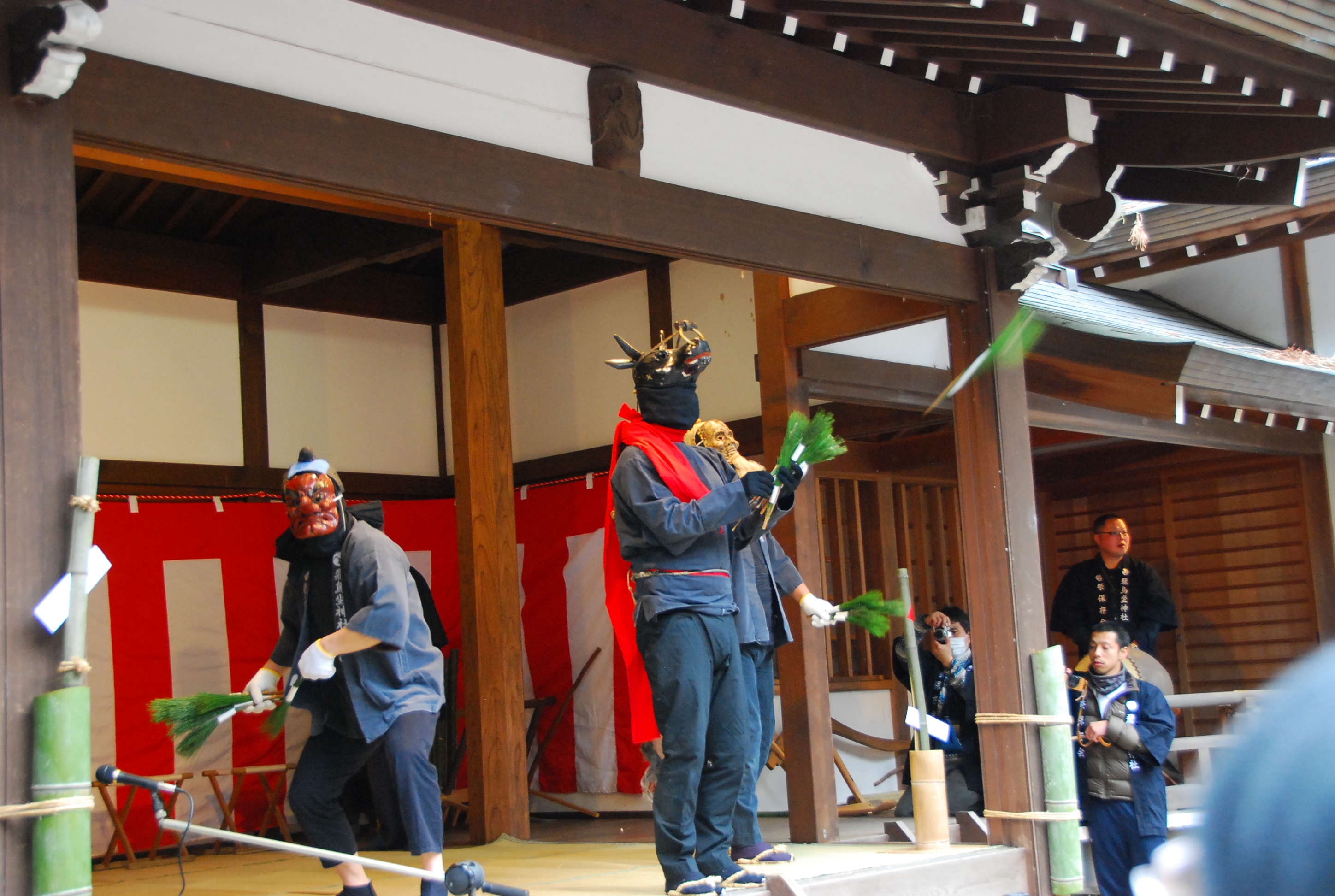 本格的に祭が始まるのは14時からですが、お昼前から神社の外で天狗と翁長がササラと呼ばれる青竹を持ってお尻を叩きながら歩きます。子供、女性には比較的優しく多々いますが、成人男性には容赦なく全力で叩きます。※正直痛いです。