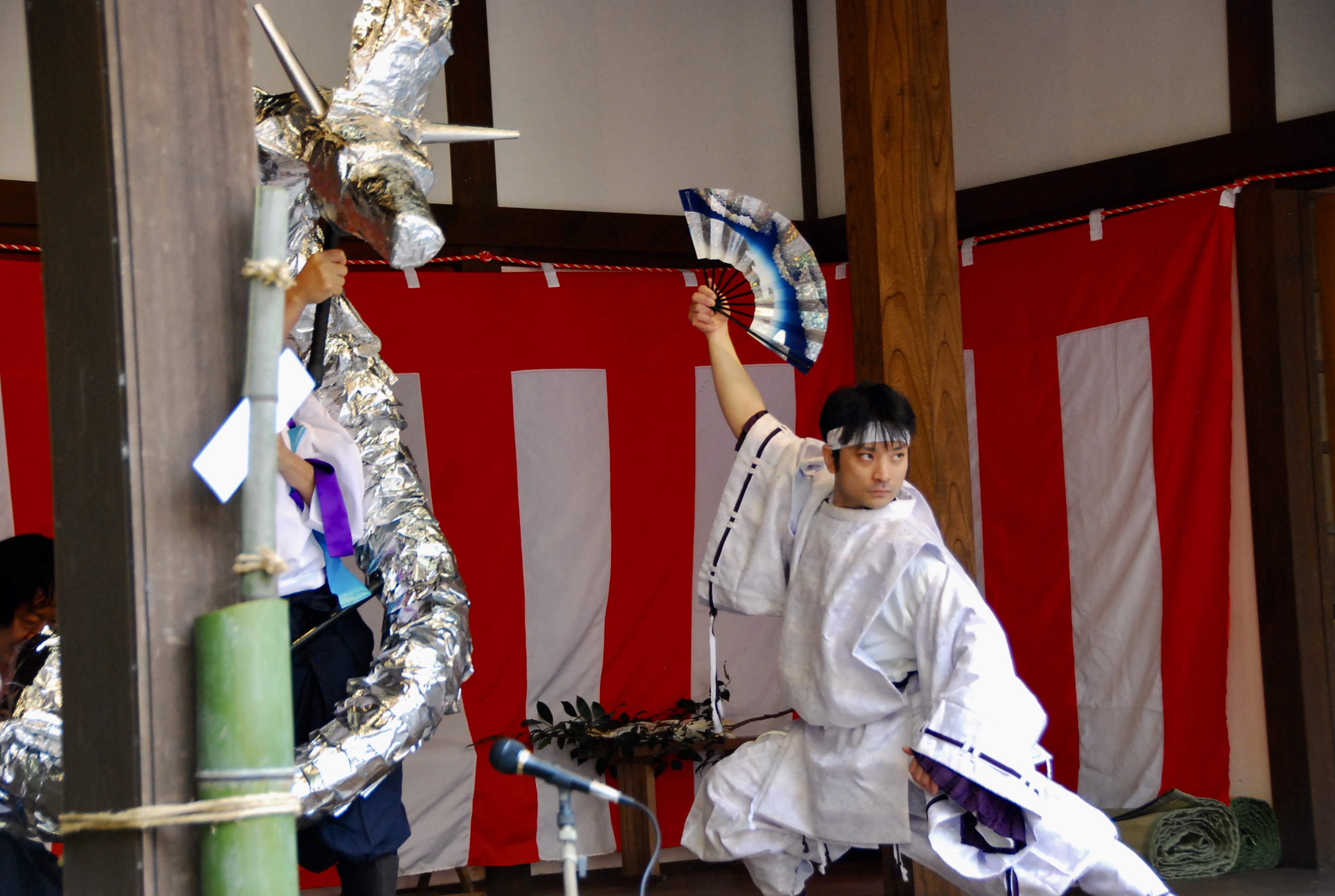 おんだ祭(御田植祭)が始まる1時間ほど前から夢想神伝流の居合奉納、奉納舞が舞台で行われます。