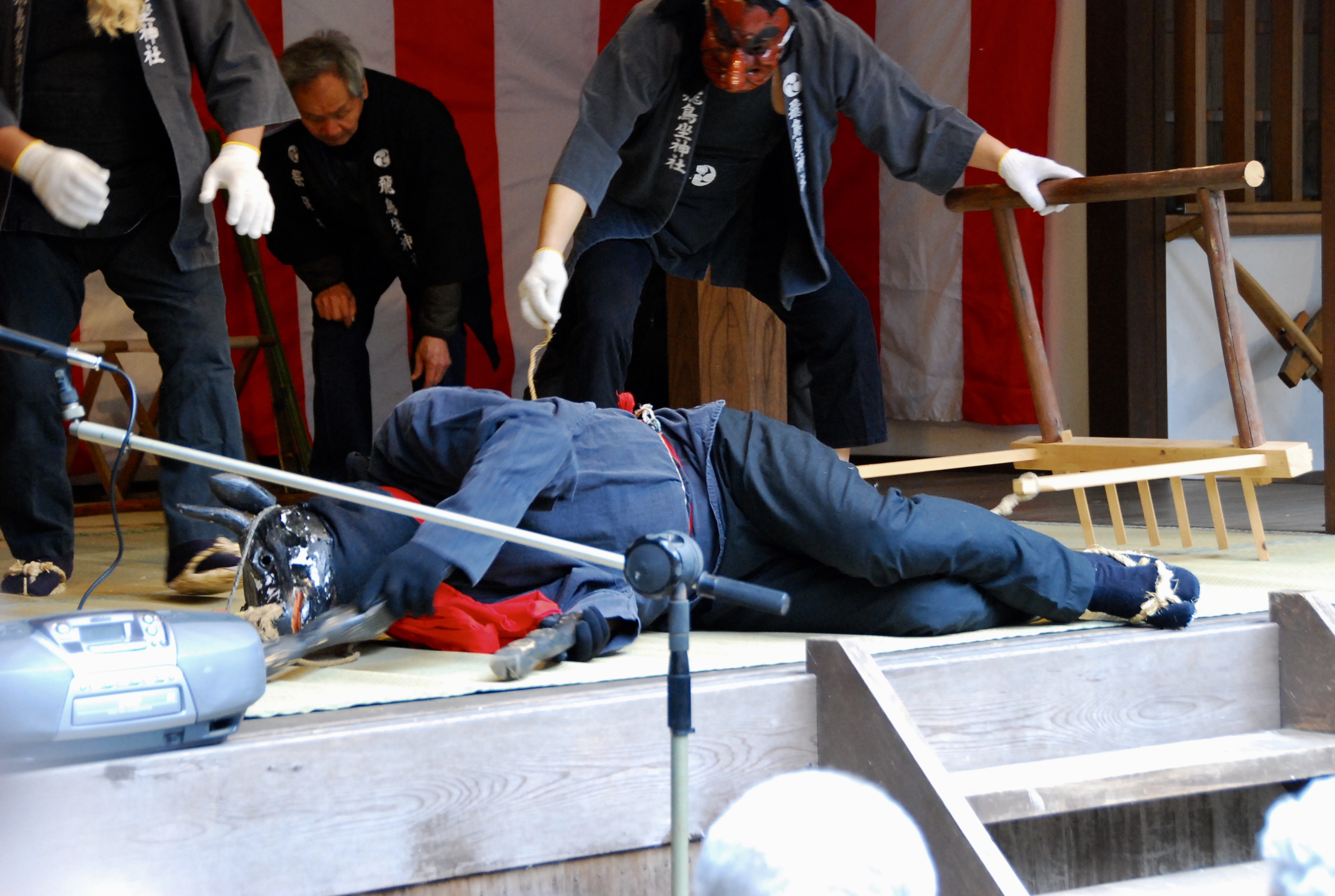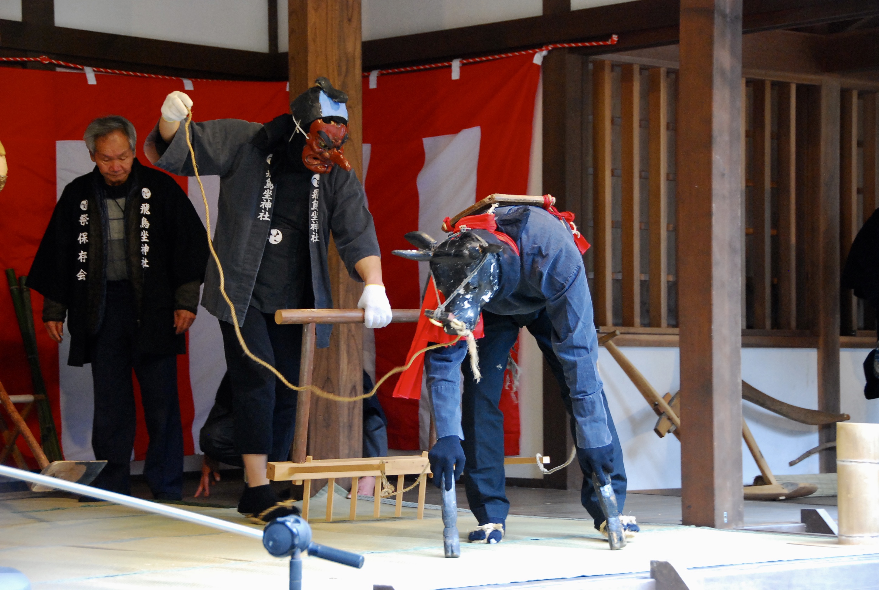 14時からおんだ祭(御田植神事)です。宮司の祝詞に始まり、翁、天狗、牛による田植の演目があります。しかしこの牛はサボりぐせがあり、隙あらば逃げようとしたり、寝たりして困らせます。ユーモラスな田植の様子が印象的です。