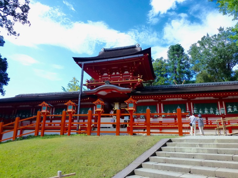 春日山原始林を背景に奈良公園内にある神社です。世界遺産「古都奈良の文化財」であり、 奈良時代に平城京の守護と国民の繁栄を祈願する為に創建され藤原氏の氏神を祀ります。全国に約1000社ある春日神社の総本社であり、主祭神:武甕槌命が白鹿に乗ってきたとされることから、鹿を神使としています。